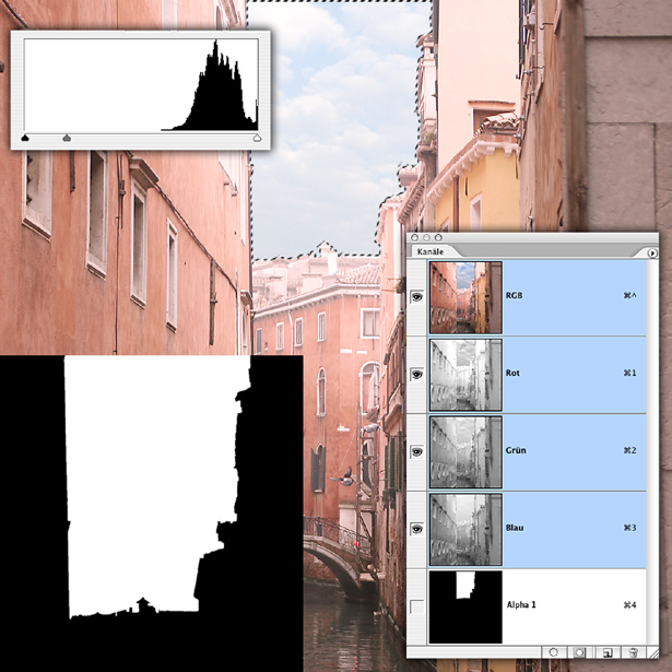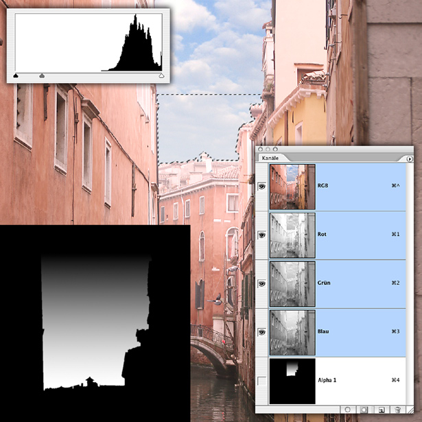 Der anteilige Schutz eines Bildes, abhängig davon, wie hell oder dunkel der als Auswahl geladene Kanal an der entsprechenden Stelle ist, funktioniert nicht nur beim Weichzeichnen harter Konturen, sondern mit allen Graustufen eines Kanals. Das können auch die eines Farbkanals sein, eines Graustufenbildes, das in einen Kanal eingefu?gt wurde, oder eines Verlaufs. In diesem Bild wurde der Kanal, in dem die Auswahl des Himmels gesichert worden war, erneut als Auswahl geladen und aufgehellt; die neue Position der Regler der Tonwertkorrektur (Bild > Anpassen) sehen Sie oben links. Die Auswahl wird dabei von einer wandernden Kontur eingegrenzt, die Sie zum Zweck besserer Bildbeurteilung per Strg-/Befehlstaste-H ausblenden können.