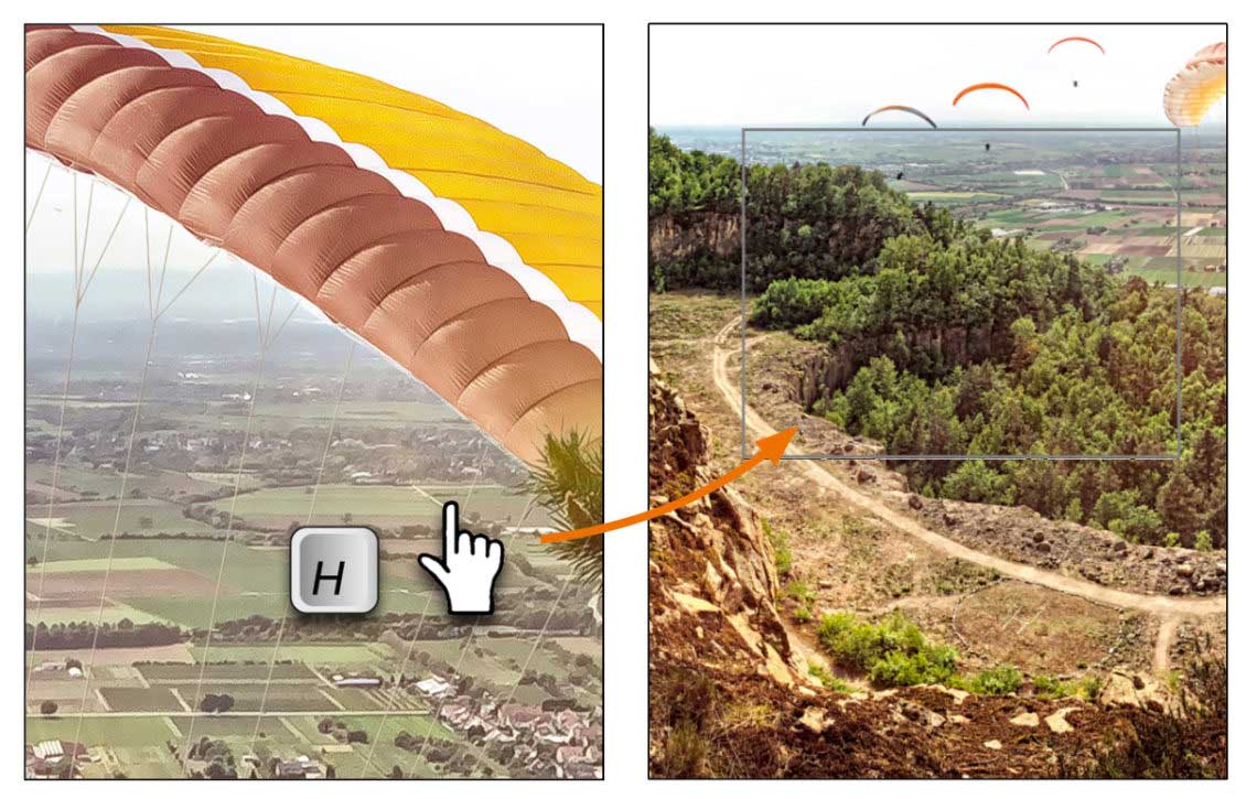 Der resultierende neue Bildausschnitt wird durch einen grauen Rahmen visualisiert. Die Funktion ist auch sehr praktisch, um kurz zu überprüfen, wo man sich denn gerade im Bild befindet – beispielsweise bei genauer Bildretusche oder dem Freistellen mit dem »Zeichenstift«. Und so geht es: Drücken und halten Sie die »H«-Taste und klicken Sie ins Bild. Das Bild wird nun so lange verkleinert angezeigt, wie Sie die linke Maustaste drücken. Dabei können Sie den gewählten Bildausschnitt verändern. Lassen Sie die Maustaste los, zoomt das Bild auf den neuen Ausschnitt in der zuvor gewählten Zoomstufe und Sie kehren zu dem Werkzeug zurück, mit dem Sie vorher gearbeitet haben.