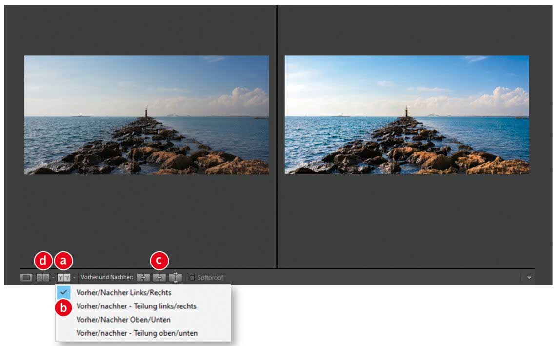 Bei der Bildbearbeitung ist man in Lightroom Classic in der Lage, komfortabel zwischen der Vorher- und Nachher-Ansicht zu wechseln, um den Fortschritt besser beurteilen zu können. Mit »Shift-V« wechselt Lightroom Classic direkt zwischen Original und Bearbeitung. Zur gewohnten Splitscreen-Ansicht gelangen Sie mit »Y«. Mit einem Klick auf das Symbol »Zwischen Vorher- und Nachher-Ansicht wechseln« (a) schaltet die Software unter den Darstellungsvarianten (b) um. Bearbeitungseinstellungen sind ebenfalls mit einem Klick auf die Symbole (c) zwischen der Vorher- und Nachher-Version übertragbar, hierbei sollten Sie aber darauf achten, dass die Einstellungen nicht versehentlich überschrieben werden. Ähnliche Fotos können Sie über die Referenzansicht (d) nebeneinander anzeigen, um manuell das aktuelle Bild der Referenz anzugleichen. Um ein Foto als Referenz auszuwählen, klicken Sie es mit der rechten Maustaste in der Bibliothek an und selektieren Sie aus dem Menü »Als Referenzfoto festlegen«.