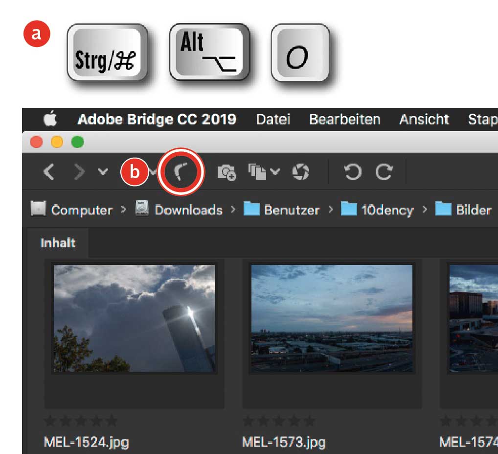 Um zwischen Bridge und Photoshop zu wechseln, können Sie die Standard-Tastaturkürzel Ihres Betriebssystems nutzen, also beispielsweise »Strg/Cmd-Tab«. Adobe hat jedoch eine eigene Abkürzung eingebaut: Mit dem Shortcut »Strg/Cmd-Alt-O« (a) springen Sie von Photoshop zu Bridge und zurück. Möchten Sie aus Bridge eine Datei in Photoshop öffnen, lassen Sie einfach die »Alt«-Taste weg: »Strg/Cmd-O«.