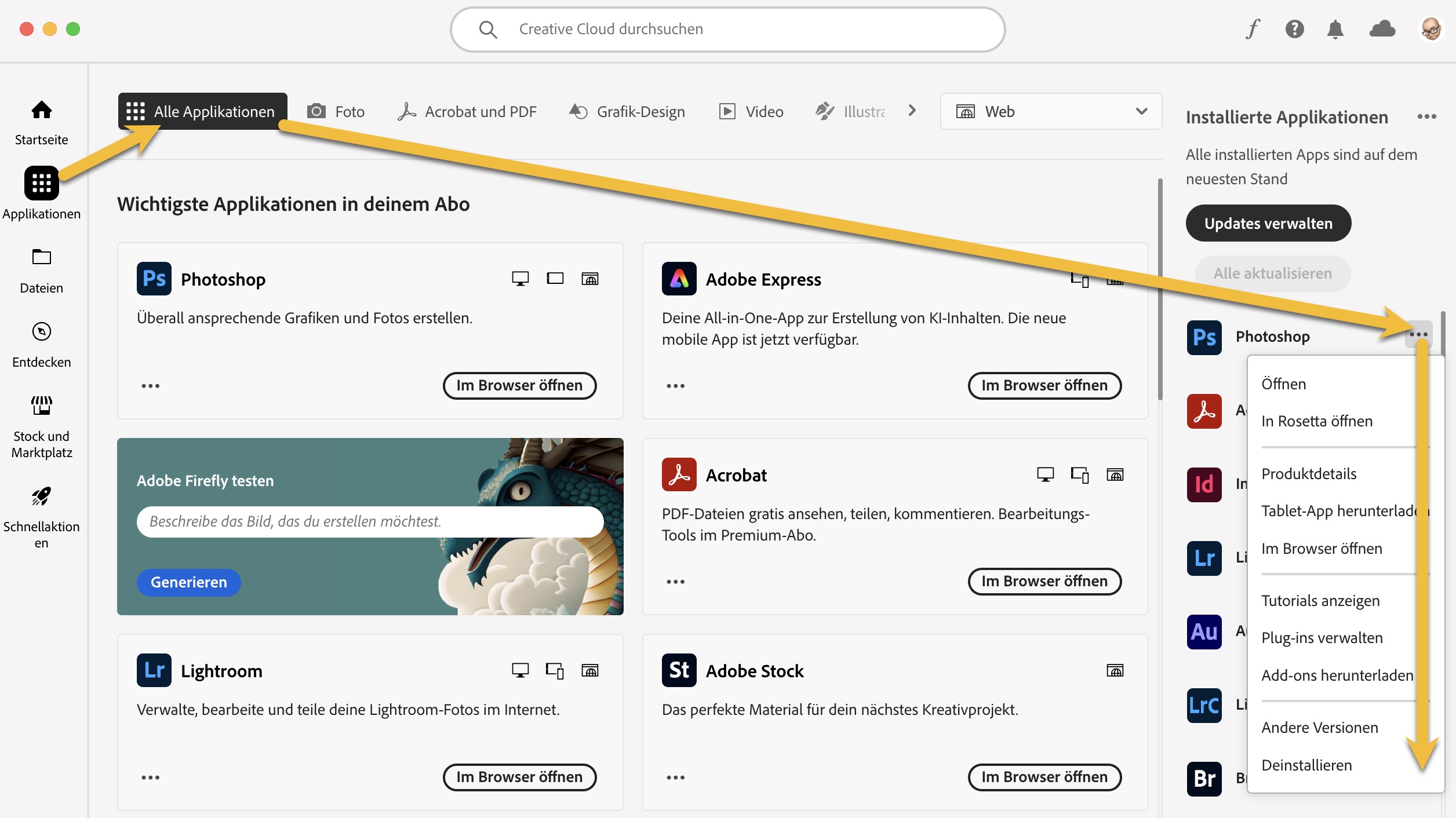 Durch das schreckliche, neue Design der Creative-Cloud-App ist der Deinstallationsbefehl nicht wirklich intuitiv zu finden.