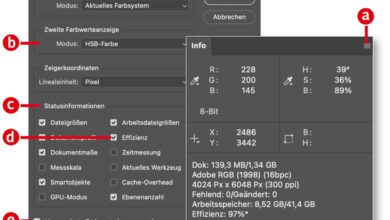 Über die »Einblenden«-Optionen am unteren Rand des Dialogs »Symbolleiste anpassen« deaktivieren Sie bei Bedarf die Schaltflächen für die »Zusätzlichen Werkzeuge«, den Farbwähler, den Maskierungsmodus und den Bildschirmmodus. Falls Sie immer das Fenster »Farbe« geöffnet haben, ist der ­Farbwähler in der Werkzeugleiste vielleicht entbehrlich. Nicht empfehlen würde ich Ihnen das Ausblenden der Schaltfläche für den »Maskierungs­modus«, da dessen unbeabsichtigte Aktivierung eine häufige Ursache für vermeintliche Photoshop-Probleme ist. Mit dem Symbol sehen Sie sofort, was Sache ist.