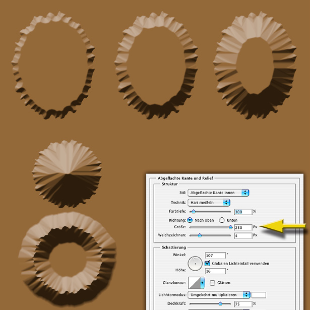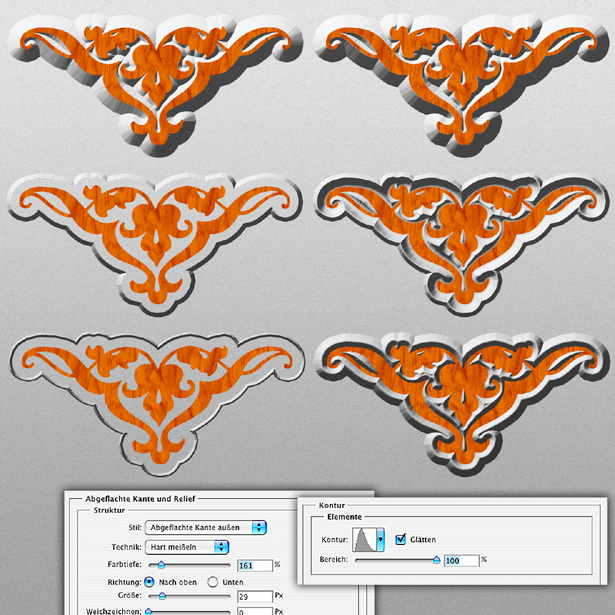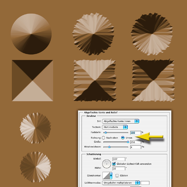 Die beiden Optionen für ?Richtung?: ?Nach oben? und ?Unten?, haben nur indirekt mit der Schattierung und dem Winkel zu tun, mit dem das plastisch geformte Objekt beleuchtet wird. Diese Parameter spielen zwar durchaus eine Rolle, aber es wäre unzutreffend anzunehmen, die genannten Optionen bedeuteten die Platzierung eines imaginären Scheinwerfers einmal von oben und das andere Mal von unten. Die sechs Beispiele in der oberen Bildhälfte könnten dieses Missverständnis zwar untermauern ? dass diese Annahme falsch ist, zeigen aber die beiden Beispiele links unten, die Umschaltung sollte bei seitlicher Beleuchtung dann nämlich keine starken Auswirkungen haben. Tatsächlich ist mit ?Richtung? gemeint, dass das entstehende Objekt bei ?Nach oben? als Erhöhung, bei ?Unten? als Vertiefung wahrgenommen wird.