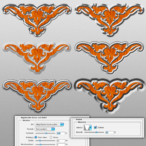 Die Erscheinungsform der Kontur können Sie über das gewählte Profil und die ?Bereich?-Einstellung regeln, aber auch die Parameter von ?Abgeflachte Kante und Relief? wie ?Farbtiefe?, ?Größe? und ?Weichzeichnen? wirken sich hier aus. Wie erwähnt, ist es zu empfehlen, als Technik ?Hart meißeln? vorzugeben, da bei ?Abrunden? Glanz- und Formkontur nicht mehr genau zusammenpassen. Ebenso ist es sinnvoll, immer die Option ?Glätten? einzuschalten, da dies die resultierenden Konturen feiner und exakter erscheinen lässt.