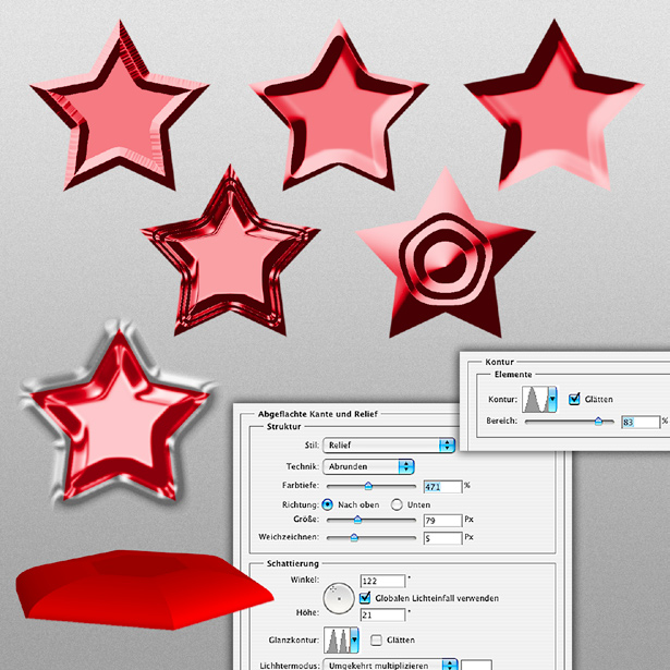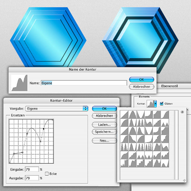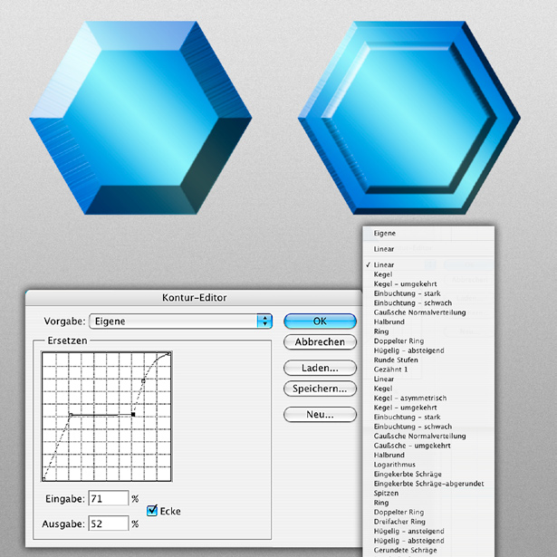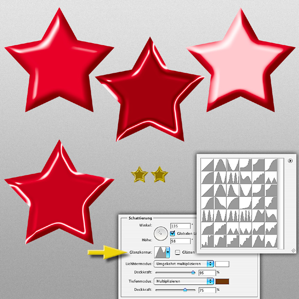 Es ist wichtig, zwischen der Glanzwirkung einer Kontur und ihrer Form zu unterscheiden. Die ?Glanzkontur? beeinflusst, wie sich das Licht in diesem Konturbereich verhält. Die vorgegebene Glanzkontur ist eine glatte Diagonale von rechts oben nach links unten; Sie sehen sie in der geöffneten Konturenpalette (rechts) links oben. Dies ist die einfachste Form, die einer schrägen Abkantung entspricht. Diese Palette öffnen Sie, indem Sie das kleine Feld mit der Miniaturansicht der Glanzkontur doppelt anklicken. Die Option ?Glätten? rechts neben der Miniatur wirkt sich besonders bei zackigen Konturformen und kleinen Objekten ? wie den gelben Sternen in der Bildmitte ? aus. Experimentieren Sie auch mit anderen ?Stilen? wie etwa ?Abgeflachte Kante außen?.
