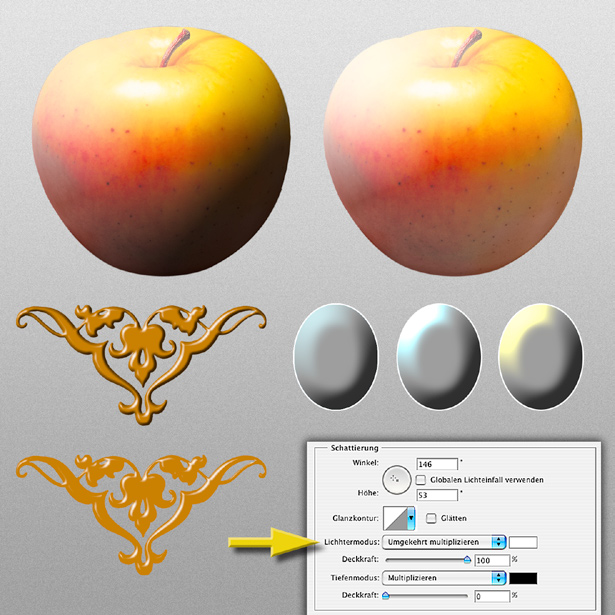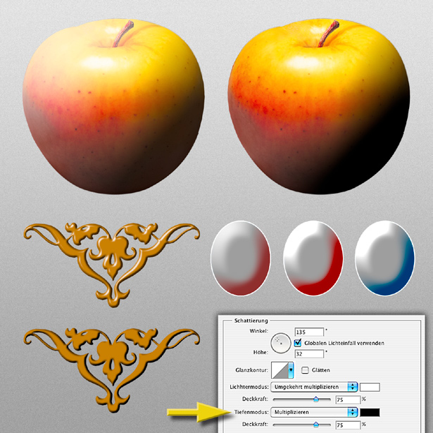 Zur helligkeitsbezogenen Herausarbeitung der Kanten stellt Photoshop zwei unabhängig voneinander einstellbare Regler bereit, den einen zur Aufhellung der dem Licht zugewandten Kanten, den anderen zur Abdunklung der im Schatten liegenden. Sie können bei beiden drei Parameter beeinflussen: Deckkraft, Modus und Farbe, die letztgenannte, indem Sie in das kleine Farbfeld rechts doppelklicken. Die Ovale demonstrieren die Wahl von Blau und Gelb statt Weiß sowie andere Lichtermodi statt des voreingestellten ?Umgekehrt multiplizieren?. Mitunter benötigt man für ein Projekt eine plastische Aufhellung ohne gleichzeitige Abdunklung der gegenüberliegenden Kanten; der rechte Apfel und das untere Ornament zeigen entsprechende Anwendungen. Setzen Sie in einem solchen Fall die Deckkraft von ?Tiefenmodus? einfach auf Null.