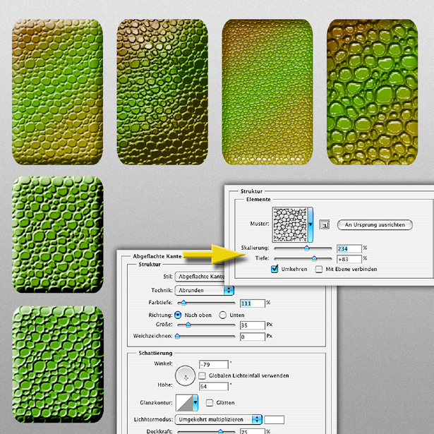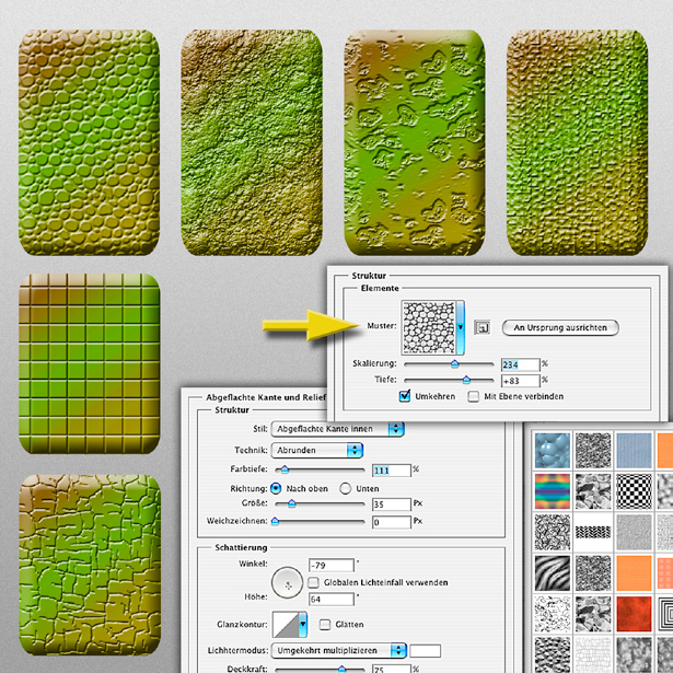 Das Erscheinungsbild einer Struktur lässt sich mit verschiedenen Methoden beeinflussen. Zum einen gibt es im ?Struktur?-Fenster (Mitte rechts) zwei Regler für ?Skalierung? und ?Tiefe?. Die Skalierung steht als Vorgabe auf 100 Prozent, um Unschärfe zu vermeiden, sollten Sie feste Größen wie 50, 25 oder 200 und 400 Prozent verwenden. ?Tiefe? definiert, wie stark die Prägung erscheint, sie reicht von – 1 000 bis +1 000 Prozent. Dabei ist die Ausprägung eines negativen Wertes identisch mit der des positiven und der aktivierten Option ?Umkehren?; die Beispiele links unten zeigen eine erhabene und eine eingeprägte Struktur. Neben diesen Parametern bestimmen aber auch die sonstigen Vorgaben wie Beleuchtung, ?Größe? oder ?Farbtiefe? das Ergebnis erheblich.