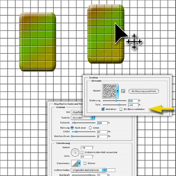 Sie können die Struktur manuell frei verschieben, so lange das Fenster ?Abgeflachte Kante und Relief? geöffnet ist. Dabei wirken die Pixel der Ebene wie ein Loch, durch das Sie im Hintergrund die verlagerte Struktur sehen. Es gibt zwei Optionen, mit denen Sie eine Verknüpfung der Struktur vornehmen können: ?Am Ursprung ausrichten? bedeutet, dass die Struktur an der linken oberen Ecke der Arbeitsfläche fixiert wird und von dort aus die Anschlusskachelungen berechnet werden; das ist sinnvoll, wenn Sie gewährleisten wollen, dass alle Elemente mit dem Muster in identischen Abständen verbunden sind. Das Muster ist hier im Hintergrund Grau auf Weiß dargestellt. Aktivieren Sie ?Mit Ebene verbinden?, so können Sie später Ebenenelemente mit dem Bewegen-Werkzeug einschließlich der Struktur frei verschieben (oben rechts).Technik