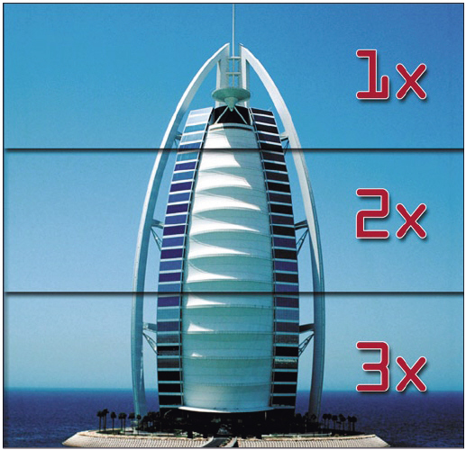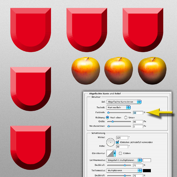 Der Begriff ?Farbtiefe? steht für die Härte der Beleuchtung und ebenfalls für die Höhenausprägung des Objekts. Das rote Wappenschild hat zunächst eine Farbtiefenzuweisung von 50 Prozent; sie steigt (von links nach rechts, dann von oben nach unten) auf 120, 150, 200 und schließlich auf das Maximum von 1 000 Prozent (links unten). Die Schatten werden dunkler, die beleuchteten Konturen heller, gleichzeitig treten Unregelmäßigkeiten der Kontur deutlicher hervor. Dasselbe lässt sich bei den drei Äpfeln beobachten; hier steigt der Wert von 100 über 120 auf 150.