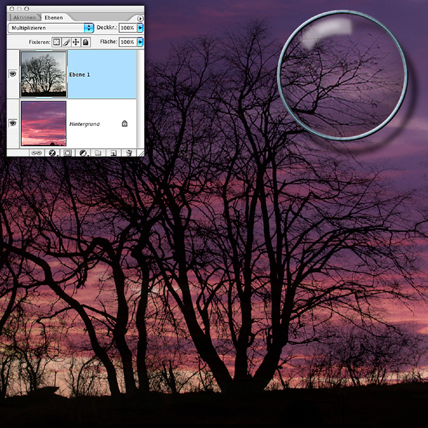 Die Montage ist mit einem einzigen Klick erledigt: Alles, was Sie tun müssen, ist, den Modus der oberen Baum-Ebene von „Normal“ auf „Multiplizieren“ zu setzen. Da die Bäume ohnehin sehr dunkel sind, ändert sich durch diesen Eingriff an ihrer Erscheinungsweise nichts. Wie die Vergrößerung unter der Lupe zeigt, werden auf diese Weise selbst die feinsten Zweige übertragen, die einer normalen Farbauswahl mit hoher Wahrscheinlichkeit zum Opfer fallen würden. Sie müssen sich auch nicht mit der Frage auseinandersetzen, was mit den schwierigen Randpixeln wird, welche davon zur Auswahl gehören und welche nicht. Wie bereits erwähnt, es ist nicht immer so einfach, aber manchmal kann man zumindest Teilbereiche eines Objekts auf diese Weise mit einem neuen Hintergrundbild kombinieren.