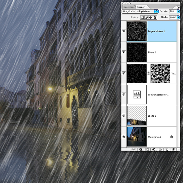 Hier sehen Sie das Ergebnis der Zusammenführung; die drei oberen Regen-Ebenen, alle im Modus „Umgekehrt multiplizieren“, wurden separat beibehalten, um ihre Deckkraft und Verwischungslänge genauer steuern zu können. Versuchen Sie sich vorzustellen, welchen Arbeitsaufwand es mit sich gebracht hätte, hier die hellen Striche des künstlichen Regens mit herkömmlichen Mitteln freizustellen! Durch Wahl eines geeigneten Ebenenmodus dagegen ist die Montage in Sekunden erledigt.