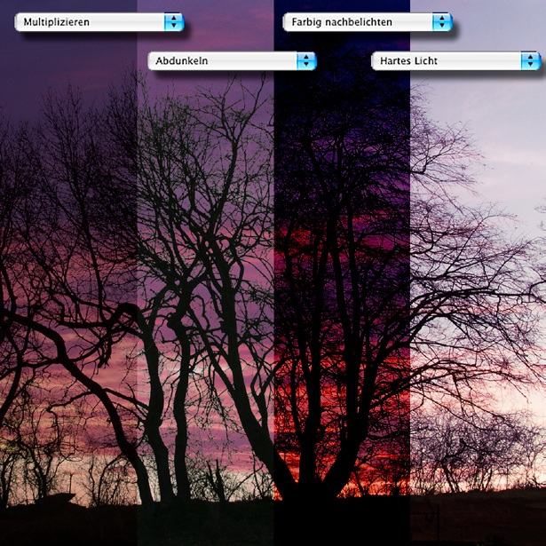 Je nach Bildvorgaben müssen Sie bei diesem Verfahren die Wahl treffen, welcher Verrechnungsmodus der oberen Ebene für die Montage das optimale Ergebnis bewirkt. Da in diesem Fall helle Bereiche der oberen Ebene ausgeschlossen werden müssen, kommen nur Verrechnungsmodi in Frage, die die dunklen Pixel bewahren und die hellen ausschließen. Sie sehen hier nebeneinander vier Varianten: „Multiplizieren“, „Abdunkeln“ (was bei hellerem Himmel deutlich weniger Äste bewahrt), „Farbig nachbelichten“ (führt, ebenso wie „Linear nachbelichten“ , in diesem Fall zu einem viel zu dunklen Resultat, überträgt aber die meisten Äste) und „Hartes Licht“ (was vor allem bei den sehr dünnen, also helleren Ästen zu einer Mischfarbe mit dem Rot des Sonnenuntergangs führt). Das Absenken der Deckkraft der Ebene hilft selten weiter.
