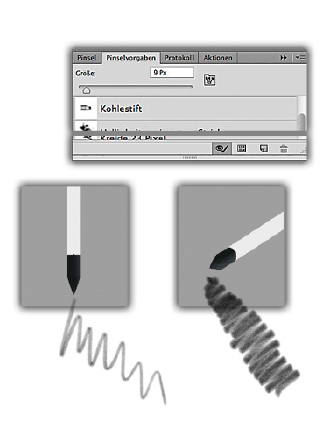 Der verbesserte, zum Cintiq gehörende Pen bietet die gleichen Möglichkeiten wie die Stifte der Intuos-Reihe: Neben der hochauflösenden Druckstufen-Sensitivität erkennt das Tablett auch die Stiftneigung. Wer die guten, alten Bleistifte noch aus eigenen Zeichen-Experimenten kennt, der weiß, wie man diese Möglichkeit gewinnbringend einsetzen konnte: Ein senkrecht gehaltener Stift erzeugt spitze, scharfkantige Linien, während man mit geneigtem (flach gehaltenem) Stift eher die großflächige Seite der Bleistift-Mine zum Zeichnen benutzt, wodurch große Flächen schnell gefüllt werden können. Das lässt sich auch in Photoshop nachstellen. Ab Version CS6 setzen Sie hierfür einfach eine der erodierbaren (abnutzbaren) Pinselspitzen – beispielsweise den Kohlestift (siehe unten) – oder die neue »Pinselprojektion« ein. Diese sind bereits so konfiguriert, dass Sie durch Schrägstellung des Stiftes die Strichbreite variieren können. In älteren Versionen lassen sich ähnliche Effekte einstellen, indem Sie den »Größen-Jitter« und den »Rundheits-Jitter« durch die »Zeichenstift-Schrägstellung« steuern.